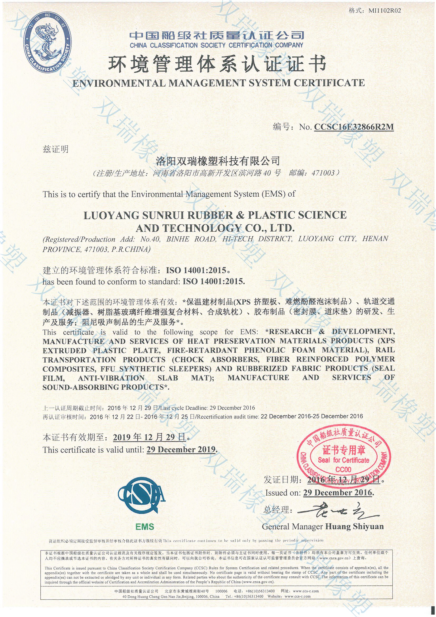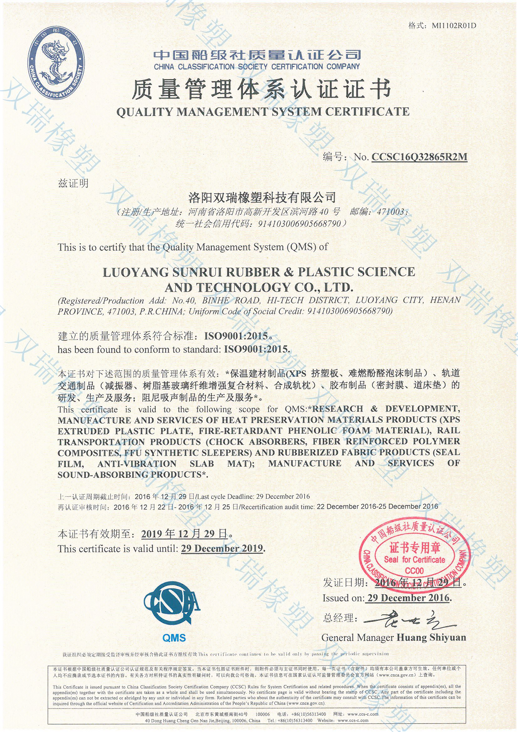 Certified by China Classification Society Certification Company and No. 00514Q20048RIM