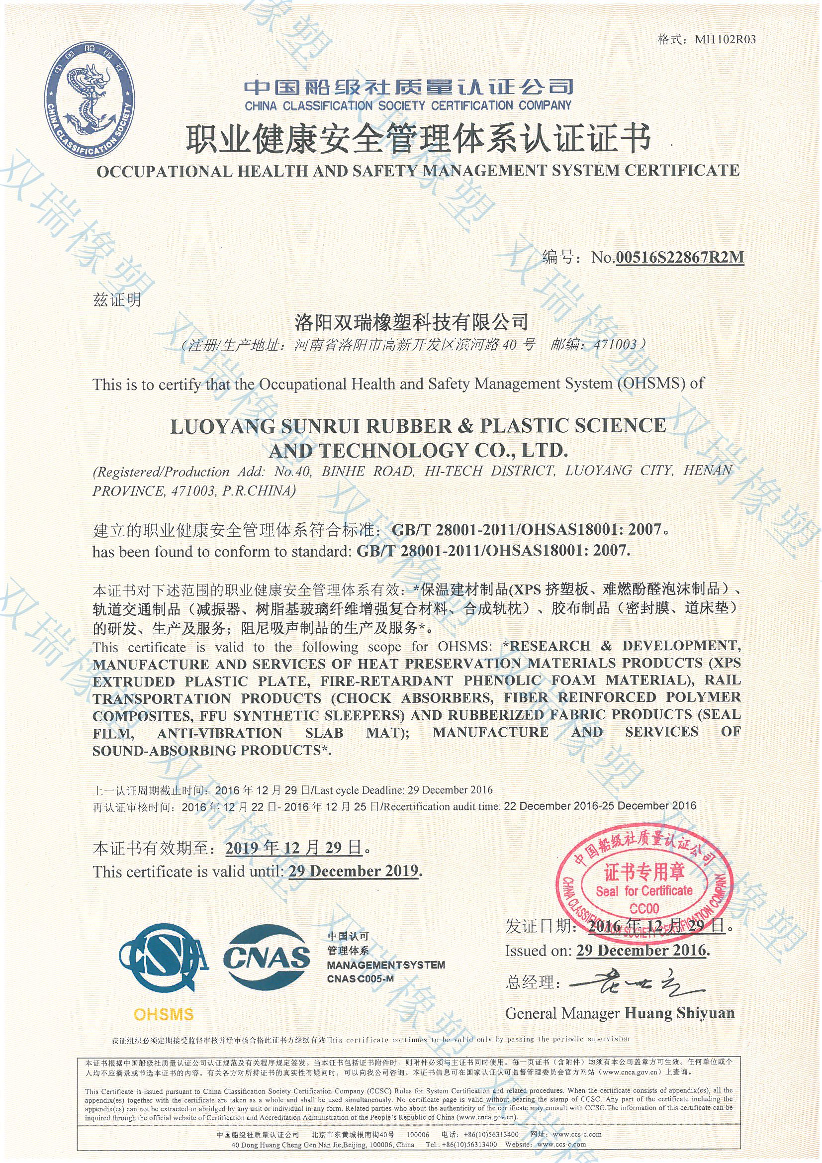 GB/T 28001 Occupational Health and Safety Management System Certificate