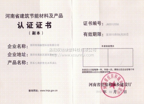 Issued by Henan Province for Flame resistant XPS panels at 2012.8.20 and No. JN 201205B